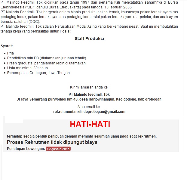 Lowongan kerja resmi PT Malindo Feedmill tidak meminta/memungut uang dari pelamar dan juga tidak mengakui adanya calo.